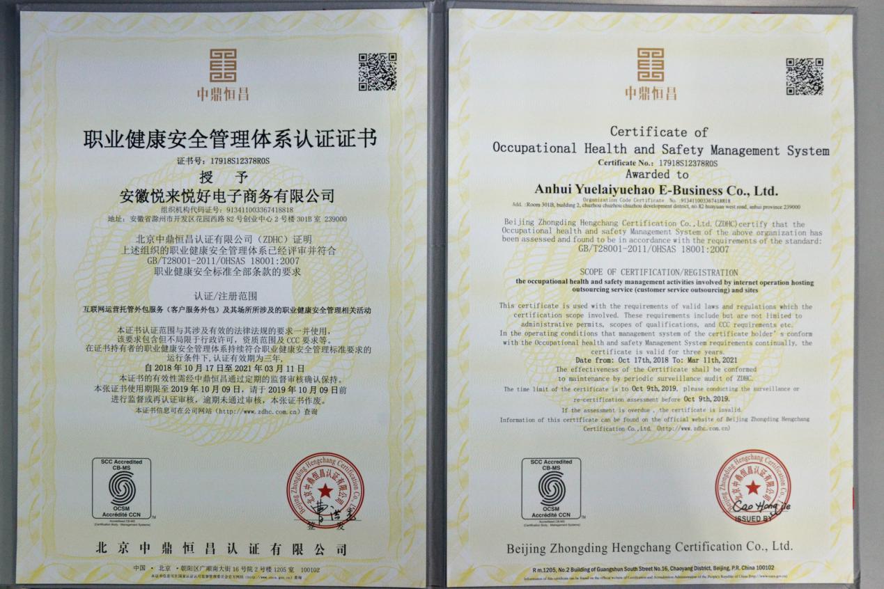 在双十一即将到来之际,悦来悦好又添喜报。安徽悦来悦好电子商务有限公司经过认证专家的严格审核,于2018年10月通过评审获得“质量管理体系认证证书”、“职业健康安全管理体系认证证书”和“环境管理体系认证证书。”此次通过三大管理体系的认证,标志着我司创立的“悦客服”客户服务外包管理体系达到国际标准要求,也为拓展多语种客服外包业务、开拓国际市场奠定坚实基础。