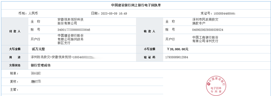 7月29日以来,受到连续强降雨和上游洪水过境影响,河北省涿州市防汛形势严峻,受灾人数超13万人。一方有难,八方支援。8月9日,安徽悦来悦好科技股份有限公司向河北省涿州市受灾地区捐款2万元,用于保障该地受灾群众人身安全、采购紧急救灾物资、救援设备以及灾后重建工作。