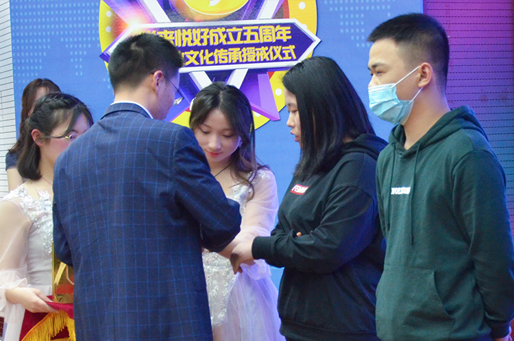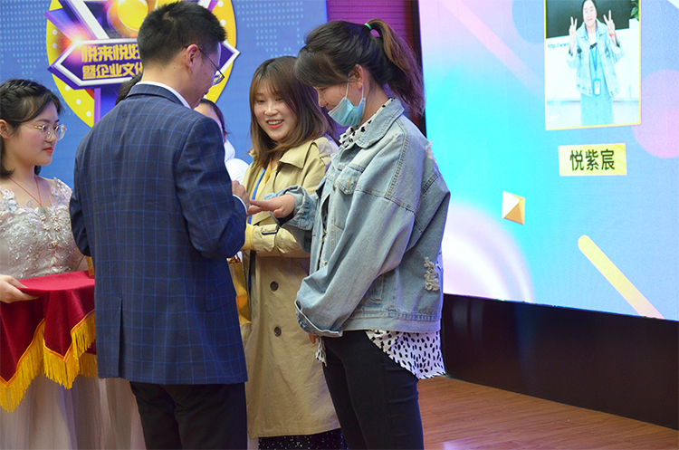 接下来就到了本次仪式最关键的时刻:为了感谢家人们为公司发展作出的巨大贡献,公司特于悦来悦好成立五周年之际,对入司一周年、三周年的员工送上一枚专属定制的戒指。