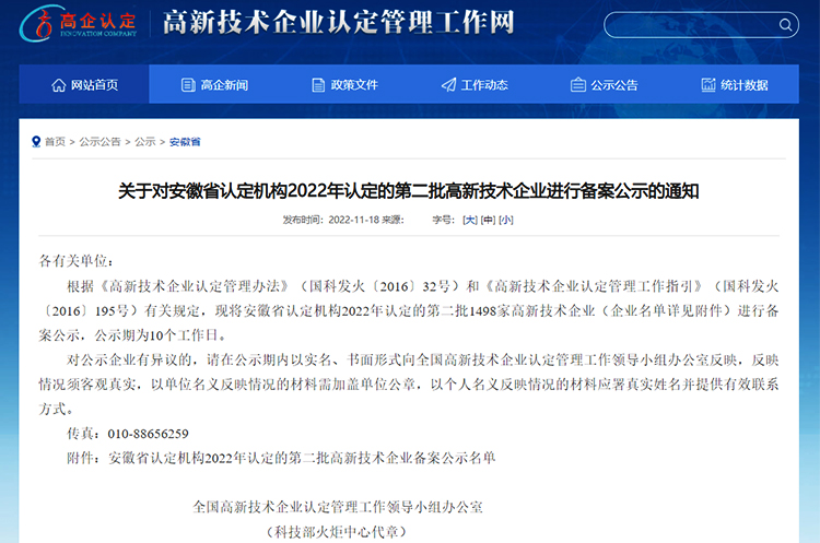 近日,全国高新技术企业认定管理工作领导小组办公室发布了《关于对安徽省认定机构2022年认定的第二批高新技术企业进行备案公示的通知》,安徽悦来悦好电子商务有限公司顺利通过第二批国家高新技术企业认定,又一次迈入国家高新技术企业行列。这是我司2019年首次被认定为国家“高新技术企业”之后,在该领域第二次获得此项荣誉!
