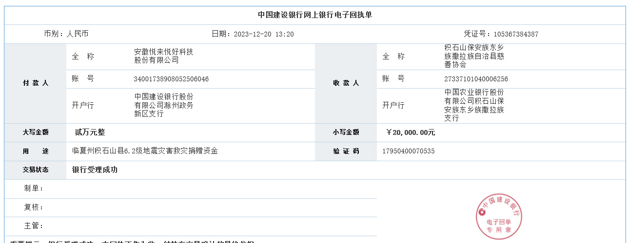 12月18日23时59分,甘肃省临夏州积石山县发生6.2级地震,造成重大人员伤亡和财产损失。一方有难,八方支援,12月20日,安徽悦来悦好科技股份有限公司迅速响应,通过积石山保安族东乡族撒拉族自治县慈善协会捐赠资金2万元,用于帮助地震灾区人民重建家园。