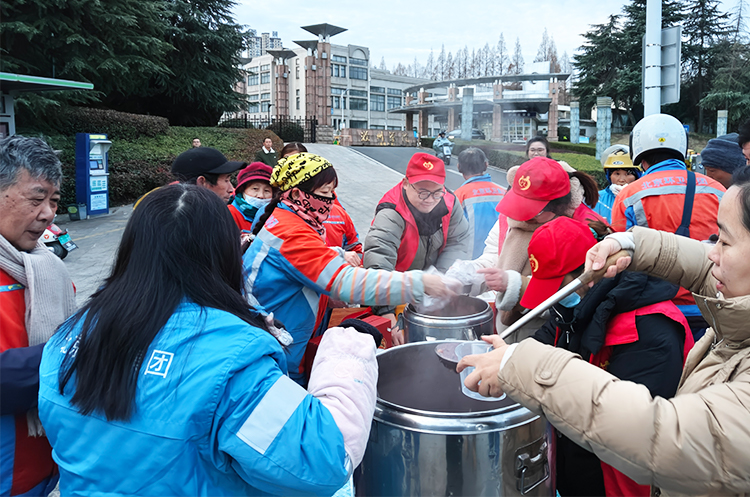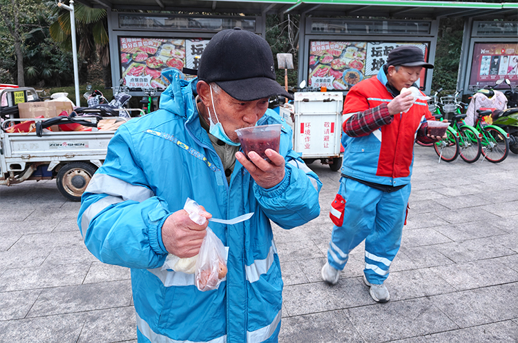 早晨7点,6名悦公益协会成员到达铜矿转盘集合点,精心准备了热腾腾的腊八粥、茶叶蛋、荤素包子等早餐。在现场志愿者的组织下,环卫工人自觉排队,志愿者们热情地将每一份热气腾腾的早餐送到环卫工人手中,还贴心嘱咐他们慢慢吃,别烫着,同时为他们送上节日的问候。