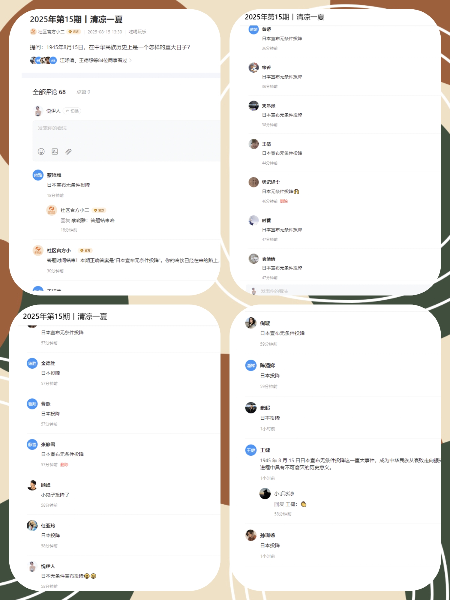 以史育人:我们希望通过这个轻松互动的形式,唤醒大家对这段光荣历史的集体记忆。 一个小小的答题环节,是我们向那段峥嵘岁月致敬的方式,也是提醒大家勿忘国耻、珍惜和平、砥砺奋进的用心。