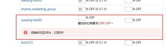 第二、所有分组都要求设置折扣,包括other组(要求全站必须设置折扣,如不单独设置则同步全站折扣,如未正确设置报错截图如下):