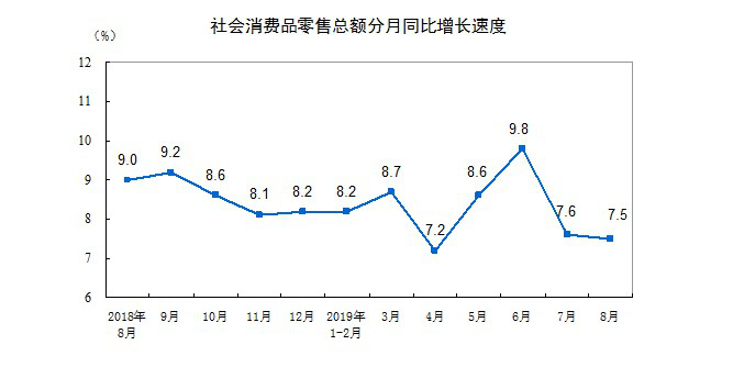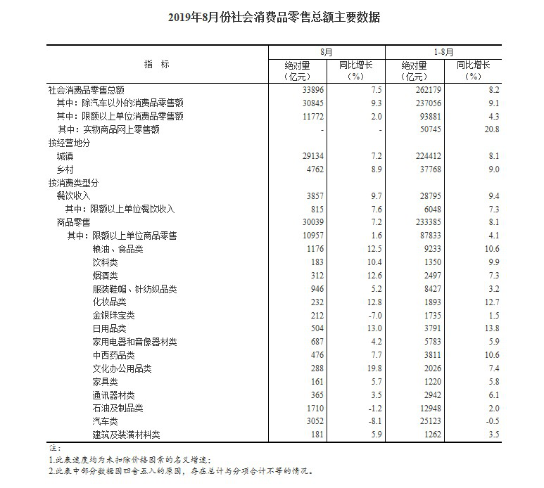 9月16日消息,据国家统计局消息,2019年8月份,社会消费品零售总额33896亿元,同比名义增长7.5%(扣除价格因素实际增长5.6%,以下除特殊说明外均为名义增长)。其中,除汽车以外的消费品零售额30845亿元,增长9.3%。